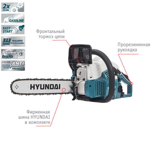 Бензопила Hyundai Х 380 – ефективна побутова пилка, що оптимально поєднує потужність з відносно невеликою вагою, що сприяє її високій продуктивності та зручності експлуатації.