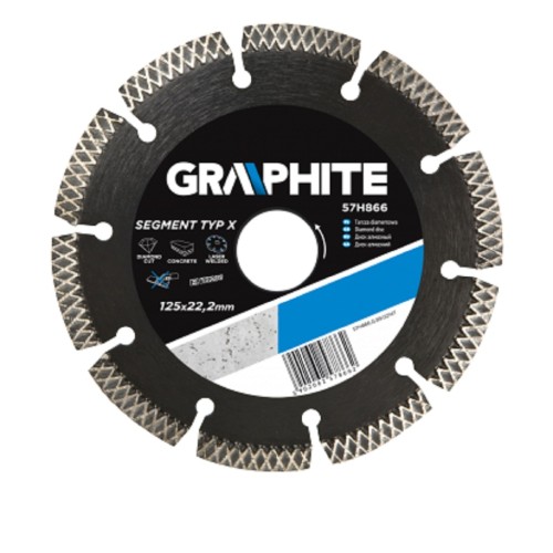 Діамантовий диск GRAPHITE призначений для важких будівельних робіт. Спеціальна конструкція сегментів (тип X) забезпечує ефективне різання бетону, сталі, армованого бетону. Прекрасно підходить для виконання робіт, що вимагають різання різних матеріалів та частої зміни типу дисків, що використовуються. Матеріалів багато – диск один.