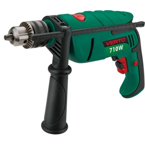 Ударний дриль 710 Вт VERTO із ключовим патроном 13 мм. З функцією свердління та свердління з ударом. Потужність 710 Вт дає можливість свердлити отвори діаметром до 25 мм у деревині, 13 мм у бетоні, а також 10 мм у сталі. Дриль обладнаний перемикачем напряму обертання право/ліво, має можливість ступінчастого регулювання швидкості, а також кнопку безперервного режиму роботи. Оснащена довгим шнуром живлення, що забезпечує вільну роботу з інструментом. Ергономічна рукоятка підвищує комфорт та безпеку роботи. Продається разом із додатковою бічною рукояткою, а також обмежувачем глибини свердління. Відповідність європейським стандартам безпеки підтверджує сертифікат CE. Бренд VERTO пропонує асортимент електроінструменту та робочого приладдя, для кожного домашнього майстра.