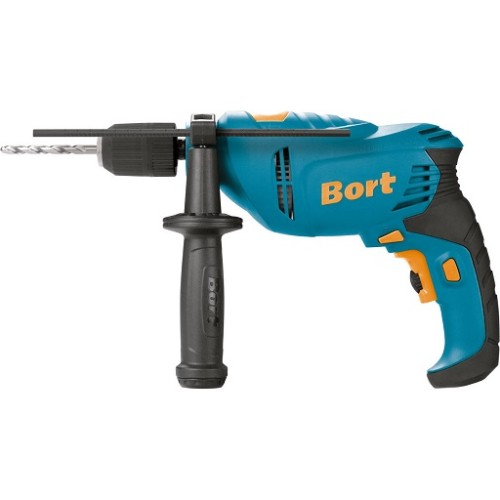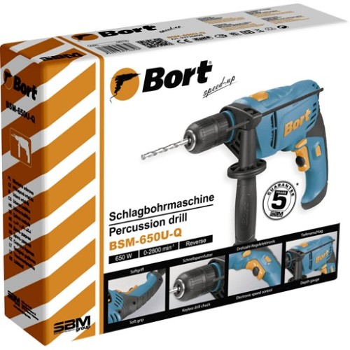 Дриль ударний Bort BSM-650U-Q - електроінструмент, що задовольняє практично всі потреби ремонту та обслуговування господарства в будинку та на дачі. Цей дриль дозволяє свердлити отвори в бетоні до 13 мм та в металі до 10 мм, що цілком достатньо для більшості робіт по дому. Рукоятка з відсіком для свердл відмінно допомагає зберігати і не втрачати свердла та біти. Швидкозатискний патрон позбавляє необхідності постійно носити з дрилем ключ для патрона. Дриль ударний Bort BSM-650U-Q - інструмент для тих, хто постійно втрачає свердла та ключі і не любить, коли розхід розкидається по інструментальній скриньці.