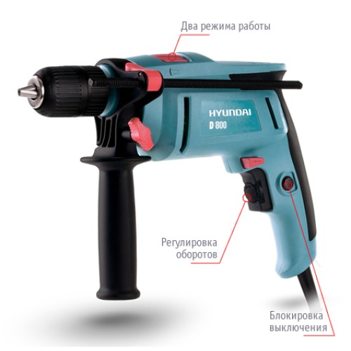Ударний дриль Hyundai D 800 — функціональний та потужний електроінструмент для просвердлювання отворів у різних матеріалах та роботи з елементами кріплення. Ергономічний та оптимально збалансований корпус моделі продуманий до найдрібніших деталей, а крім того, має чудовий дизайн.