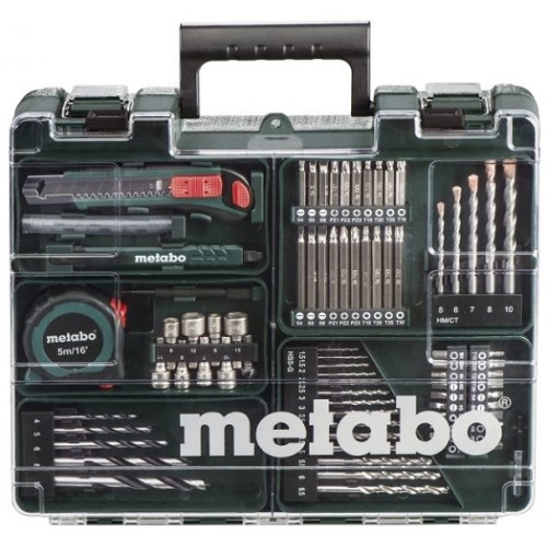 Комплектація: ударний дриль Metabo SBE 650, 65 предметів оснастки, додаткова рукоятка, обмежувач глибини свердління, пластиковий кейс