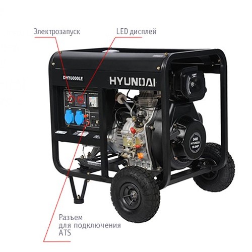 Дизельний генератор Hyundai DHY6000LE призначений для професійного використання. Ця модель призначена для інтенсивної роботи при великих навантаженнях. Рама оснащена шістьма амортизаторами для зменшення вібрації. Збільшений паливний бак робить автономну роботу тривалішою. Посилена рама знижує рівень вібрації. Генератор використовується як резервне джерело енергії або для живлення електроприладів далеко від основної мережі.