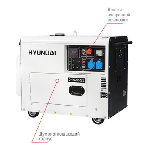 Дизельний генератор Hyundai DHY6000SE – компактний та надійний однофазний апарат для живлення електроприладів. Генератор оснащений чотиритактним двигуном об'ємом 418 см³. Датчик рівня масла припиняє роботу двигуна за малої кількості масла. Двигун оснащений електростартером, що полегшує його запуск. Електростартер працює від акумуляторної батареї, яку потрібно заряджати не менше одного разу на місяць. Модель оснащена системою стабілізації, що унеможливлює стрибки напруги.