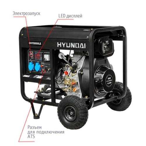 Дизельний генератор Hyundai DHY8000LE служить для постачання електрики різних споживачів, у тому числі й споживачів з високими пусковими струмами. Ця модель широко використовується на будівельних майданчиках. На генераторі встановлені дві розетки на 220 В. Розетки електростанції мають кришки з самоповоротним механізмом, які запобігають попаданню бруду та пилу, уберігаючи тим самим мережне з'єднання.