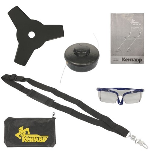 Електрокоса Кентавр СК-1238 має розширену комплектацію. У комплект поставки даної моделі входять ремінь на плечі з карабіном, 3-зубчастий ріжучий ніж, шпуля з ліскою, великий захисний кожух, зручні захисні окуляри, сумка з логотипом торгової марки з запасними інструментами і приладдям.