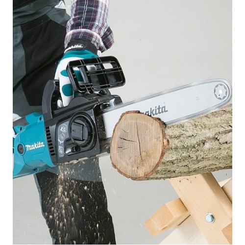 Електропила ланцюгова Makita UC3551A призначена для роботи в саду, наприклад для заготівлі дров та розпилювання колод. Металева передня частина з шипами забезпечує легке керування та зручну роботу з пилкою. Великий отвір масляного бака дозволяє користувачеві легко перевіряти рівень олії. Ергономічна передня рукоятка гарантує високу маневреність і зручне горизонтальне різання. Автоматичний масляний насос забезпечує ефективне змащення ланцюга. Натяг ланцюга без додаткових інструментів. Автоматичний масляний насос. Регульований масляний насос відключається під час роботи двигуна на холостому ходу. Пристрій для натягу ланцюга забезпечує високу ефективність роботи інструменту. Металеві завзяті зуби. У комплект поставки, окрім пили Makita UC3551A входять також шина 35 см, пиляльний ланцюг та захисний чохол.