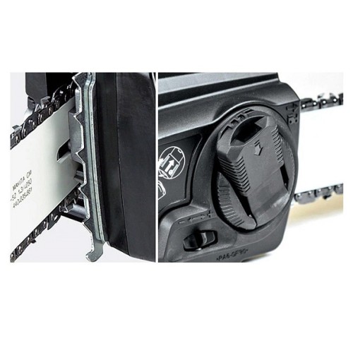 Металева передня частина інструменту з шипами забезпечує більш легке керування та зручнішу роботу з інструментом. Великий отвір масляного бака дозволяє користувачеві легко перевіряти рівень олії. Ергономічна передня рукоятка забезпечує більш високу маневреність і зручніше горизонтальне різання. Натяг ланцюга без додаткових інструментів. Автоматичний масляний насос забезпечує ефективніше змазування ланцюга. Регульований масляний насос відключається під час роботи двигуна на холостому ходу. Пристрій для натягу ланцюга забезпечує більшу ефективність роботи інструменту. Металевий стрижень для відхилення чинної сили.