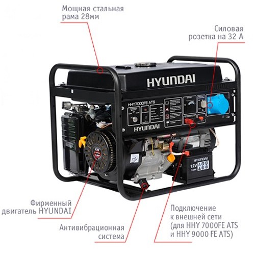 Бензиновий генератор Hyundai HHY7000FE ATS служить для постачання електрики різних споживачів, у тому числі й споживачів з високими пусковими струмами. Ця модель відмінно підійде для резервної подачі електрики, при його відключенні, для цього є вбудований блок ATS. Розетки електростанції мають кришки із самоповоротним механізмом, які запобігають попаданню бруду та пилу. Відмінною рисою даної моделі є високоякісний, чотиритактний потужний двигун HYUNDAI IC390 об'ємом 389 куб. див. Дана електростанція має вбудований блок керуючої автоматики.