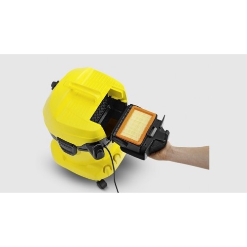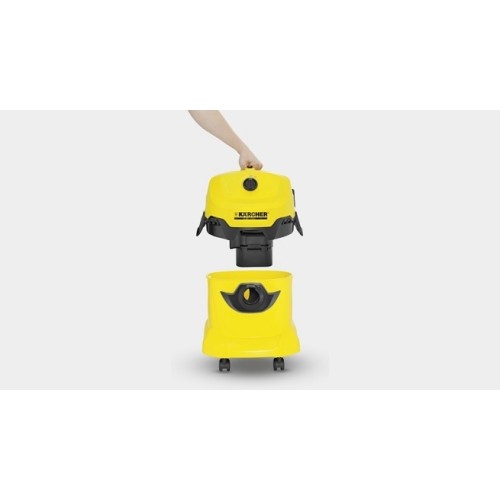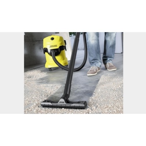 Пилосос WD 4 - початкова модель середнього класу вдосконаленого покоління господарських пилососів Kärcher - ідеальний варіант для збирання великих площ. Висока сила всмоктування при споживанні 1100 Вт. Має контейнер ємністю 20 л, що дозволяє збирати великий обсяг рідини чи сміття. Зручна конструкція системи фільтрації дозволяє зняти та відтрусити фільтр без найменшого торкання до нього руками: касетник з фільтром розташований зовні та легко знімається однією рукою (не потрібно відкривати кришку пилососу та діставати фільтр зсередини після роботи). Апарат оснащений двома подовжувальними трубками, насадкою для підлоги вологого і сухого прибирання, плоским складчастим фільтром і фільтр-мішком з нетканого матеріалу. Має функцію видування, місце для зберігання кабелю, місце для зберігання аксесуарів та зручну ручку.