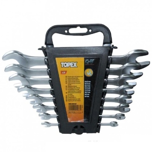Ключі гайкові з відкритою зівом Topex. У наборі 8 ріжкових ключів у розмірі 6-22 мм. Ключі виготовлені з високоякісної хром-ванадієвої сталі.