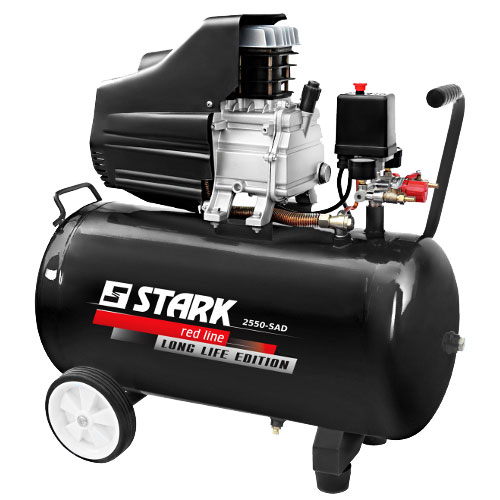 Компресор Stark 2550-SAD - це масляний, поршневий агрегат для роботи з пневмоінструментами, що вимагають подачі стисненого повітря. Побутовий апарат із збільшеним об'ємом бака-ресивера. Повітряний компресор призначений для нанесення лаків, фарб, ґрунтовки, тобто всього того, що потрібно при фарбуванні автомобіля. Нанесення антикорозійних складів у будь-які, навіть найнедоступніші місця, ще одне застосування компресора. Також агрегат використовується в роботі з полірувальними або шліфувальними інструментами або гайковертом.