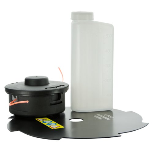 Комплектація: шпуля з ліскою, 2 ножі, плечовий ремінь, навушники, захисні окуляри, набір ключів, інструкція