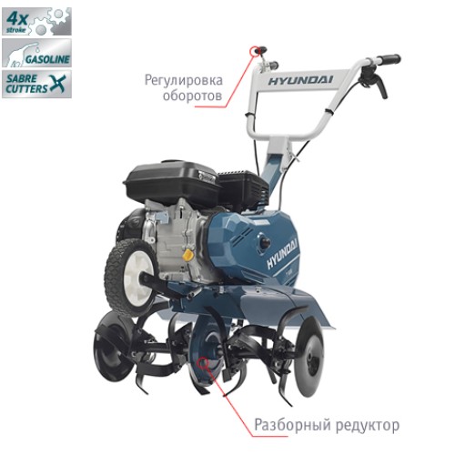 Бензиновий культиватор Hyundai T 700 оснащений 4-тактним двигуном потужністю 5.5 л. Агрегат може використовуватися для обробки ґрунту - оранки, розпушування, активного змішування землі з добривами, що вносяться. Ширина захвату за один прохід становить 60 см. Культиватор обладнаний колесом транспортування - для зручного переміщення по робочій території. За допомогою сошника можна регулювати глибину оранки.