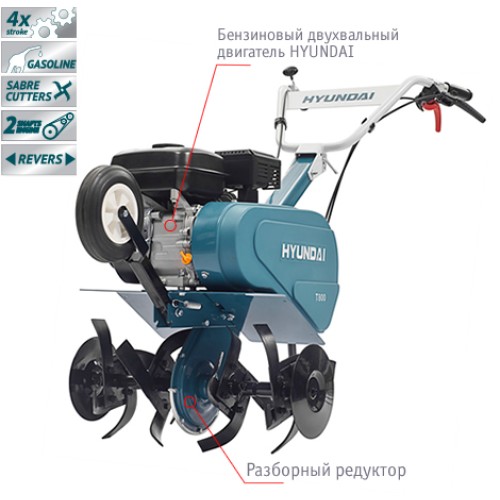 4-тактний двигун Hyundai OHV. Розроблено спеціально для культиваторів HYUNDAI. Перший вал для руху вперед, другий для руху назад. Істотно знижений рівень шуму та вібрації. Тип двигуна OHV із верхнім розташуванням клапанів. Моторний ресурс - понад 2000 мотогодин. Система полегшеного запуску. Низький рівень витрат палива.