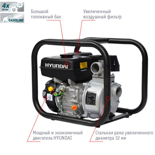 Бензинова мотопомпа Hyundai HY 50 призначена для відкачування чистої або слабко забрудненої води при чищенні басейнів, поливі або викачуванні води з льохів та підвалів. Надійну та продуктивну роботу мотопомпи забезпечує бензиновий чотиритактний двигун потужністю 5.5 л.с.