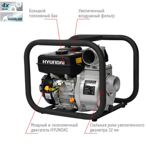 Бензинова мотопомпа HYUNDAI HY 80 призначена для перекачування чистої прісної води з частинками до 8мм з водойм, ставків, басейнів, для поливу полів, з підвалів, ставків. Дані мотопомпи використовують високоміцну алюмінієву раму, покриту напиленням для зручності транспортування. Двигуни в мотопомпах використовуються лише оригінальні від заводу Hyundai. У цих моделях використовується ручний запуск. Ці мотопомпи добре зарекомендували себе як у Європі, так і в країнах СНД.