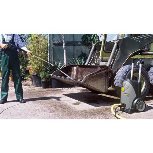 Цей апарат високого тиску без підігріву води з електричним приводом змінного струму є ідеальною моделлю початкового рівня для використання у комерційних цілях. Вертикальний HD 6/15 C відрізняється чудовою мобільністю та компактністю. Висота алюмінієвої ручки натискання може бути відрегульована. Модель характеризується такими особливостями: покриття з міцного пластику, яке захищає насос від пошкоджень і забруднення, пристрій зберігання кабелю електроживлення та відсік для зберігання насадок на задній частині апарату. Апарат поставляється з триходовою насадкою, яка дозволяє легко та швидко проводити налаштування водяної форсунки. Ви можете вибирати між точковим струменем із високим тиском, віяловим струменем із високим тиском (25°) та віяловим струменем із низьким тиском. Остання використовується для подачі засобу для чищення. Трипоршневий осьовий насос із хромованими поршнями з нержавіючої сталі та латунною головкою циліндра гарантує ефективну роботу. Особливістю цього нещодавно розробленого насоса є те, що і пристрій забору води та водоскид високого тиску виготовлені з латуні, що робить їх дуже стійкими до руйнування та корозії.