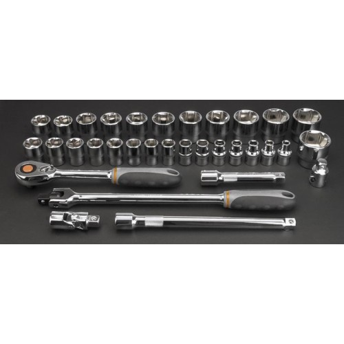 Торцеві ключі 1/2, набір 33 шт., тріскачка 245 мм, 48 зубців, перемикач напрямку обертання, рукоятка з шарніром 370 мм, 2 подовжувачі 125, 250 мм, універсальний шарнір 65 мм, перехідник 1/2M x 3/8F, 2 10, 11, 12, 13, 14, 15, 16, 17, 18, 19, 20, 21, 22, 23, 24, 25, 26, 27, 28, 29, 30, 32, 34, 35с 3