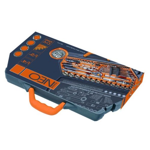 Набір торцевих ключів 1/4" та 1/2" NEO, 71 предмет, виготовлені з високоякісної хромованадієвої сталі. До складу набору входять тріскачки з міцним храповим механізмом (48 зубців). У наборі багатий асортимент змінних головок Spline 1/4" та сферичних головок 1/2", а також наконечників (шліцеві, хрестові, шестигранні, Torx з отвором). Додатково в наборі є широка гама аксесуарів, а також комбіновані ключі найпопулярніших розмірів. Набір упакований у зручну валізку. Якість інструменту підтверджена сертифікатом гарантії виробника. Бренд NEO виправдовує очікування фахівців.