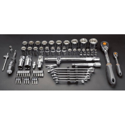 Торцеві ключі 1/4, 1/2, набір 7, 1/4: тріскачка 135 мм, 48 зубців, перемикач напрямку обертання, універсальний шарнір 35 мм, подовжувач 50 мм, перехідник до змінних наконечників, комір з шарніром 110 мм, викруткова рукоятка1 розміри: 4, 4.5, 5, 5.5, 6, 7, 8, 9, 10, 11, 12, 13 мм, 22 змінних наконечників 25 мм, розміри: шліцеві 4.5, 6.5, 8 мм, хрестові PH1, PH2, 3 H5, H6, H7, H8, Torx з отвором TT10, TT15, TT20, TT25, TT27, TT30, TT40, 1/2: тріскачка 245 мм, 48 зубця, перемикач напрямку обертання, універсальний шарнір 65 мм, 2 уд. x 3/8F, комір з шарніром 250 мм, свічкові головки, розміри: 16, 21 мм, 18 головок Spline, розміри: 10, 11, 12, 13, 14, 15, 16, 17, 18, 19, 20, 22, 20 32 мм, 6 комбінованих ключів, розміри: 8, 10, 12, 13, 14, 17 мм, сталь CrV, змінні наконечники сталь S2, пластмасова валізка