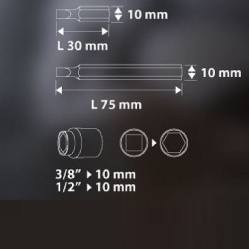 Комплектація: HEX довжина 30 мм: H4, H5, H6, H7, H8, H10, H12, HEX довжина 75 мм: H4, H5, H6, H7, H8, H10, H12, Spline довжина 30 мм: M5, M6, M8, M10, M12, Spline довжина M12, Torx довжина 30 мм: T20, T25, T30, T40, T45, T50, T55, Torx довжина 75 мм: T20, T25, T30, T40, T45, T50, T55, Перехідники: 1/2-10 мм, 3/8-10