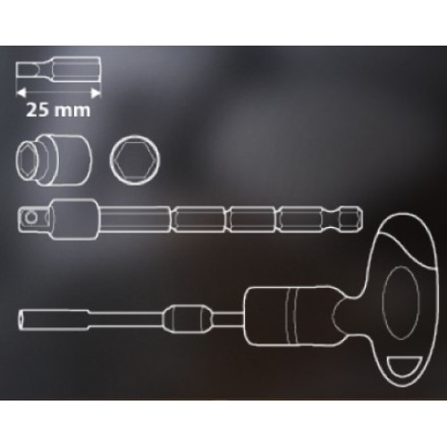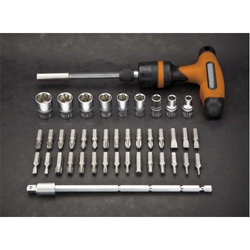 Комплектація: Т-подібна рукоятка з тріскачкою, подовжувач телескопічний для змінних наконечників, телескопічний подовжувач для головок, 9 шт. шестигранних змінних головок, розміри: 5, 6, 7, 8, 9, 10, 11, 12, 13 мм, 30 шт. наконечників, розміри: шліцеві 3, 4, 5, 6, 7 мм, хрестові 2 x PH1, 2 x PH2, 2 x PH3, 2 x PZ1, 2 x PZ2, 2 x PZ3, Torx T10, T15, T20, T25, T27, T30. H4, H5, H6.