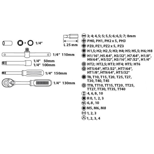 У наборі є, зокрема, широка гама змінних шестигранних головок, наконечників, викруткова рукоятка, тріскачка з храповим механізмом з 48 зубцями.
