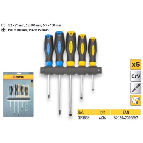 Деталі: Викрутки, набір 5 шт., Загартоване жало, намагнічене жало, сталь CrV, двокомпонентна рукоятка, розміри: 3.2 x 75 мм, 5 x 100 мм, 6.5 x 150 мм, PH1 x 100 мм, PH2 x 150 мм, з веш