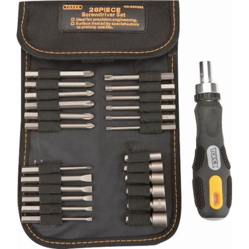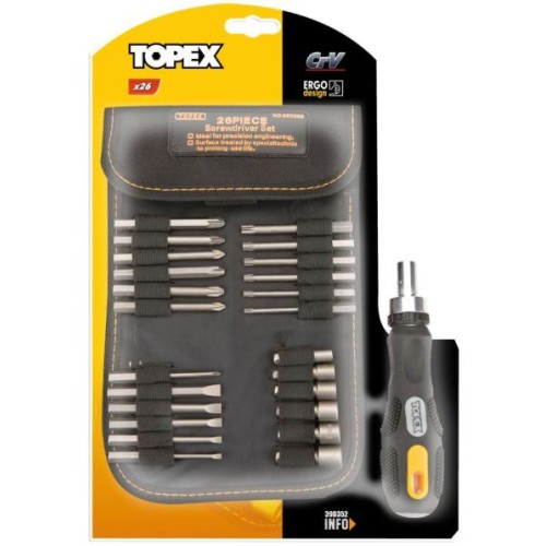 Набір змінних наконечників та головок TOPEX складається з 26 предметів, упакованих текстильний футляр.