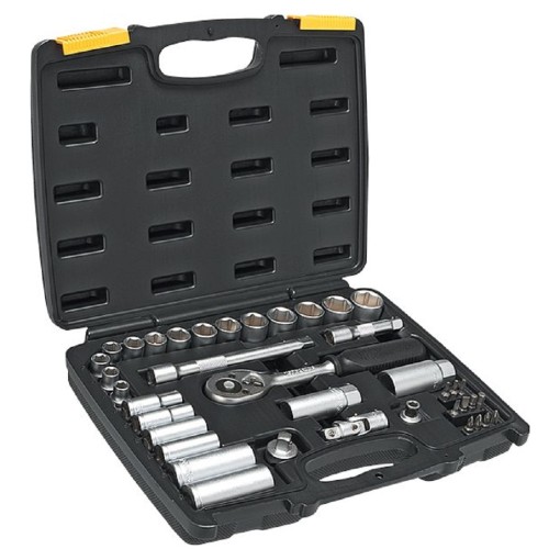 Комплектація: тріскачка 210 мм (24 зуби), перехідник шарнірний 55 мм, 2 подовжувачі 70, 150 мм, перехідник для насадок, перехідник 3/8"M x 1/2"F, 14 шестигранних торцевих головок коротких, 6 шестигранних торцевих головок шт. насадок 30 мм.