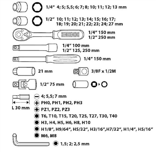 Комплектация: 1/4" трещотка 150 мм, (24 зуба), удлинитель 100 мм, переходник для насадок, держатель для насадок 150 мм, 10 шт. шестигранных головок, 32 насадки 30 мм; 1/2" трещотка 250 мм 24 (зуба),переходник шарнирный 75 мм, 2 удлинителя 125, 250 мм, переходник 1/2"M x 3/8"F, головка свечная, 16 шт. шестигранных головок, 3 шестигранных ключа 1.5, 2, 2.5 мм.