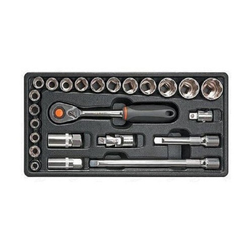 Набір головок Neo Tools складається з 24 предметів, виготовлених із високоякісної хромованадієвої сталі. До складу набору входить тріскачка з міцним храповим механізмом (48 зубців). У наборі багатий асортимент змінних головок (розміри від 10 до 32 мм). Додатково є подовжувачі, шарнір, перехідник 1/2"M x 3/8"F і головки свічки. Набір продається в упаковці, що підходить формою до висувних ящиків інструментального візка NEO. Надійність інструменту підтверджує гарантія 25 років. Бренд NEO виправдовує очікування фахівців.