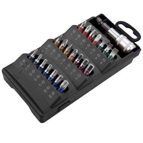 Змінні наконечники GRAPHITE, у наборі наконечники 1/4" x 25 мм найпопулярніших розмірів і типів. Спеціальна конструкція коробочки для зберігання дозволяє закріпити її на поясі монтажника. За допомогою спеціальної системи насадки можна витягнути і сховати назад однією рукою, що значно полегшує доступ до наконечників та їх зміну. ідентифікацію необхідного наконечника.