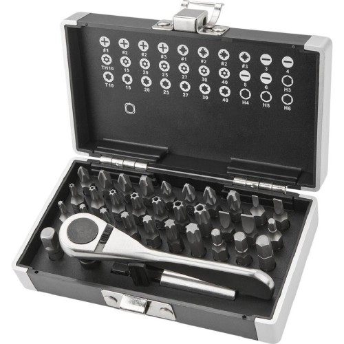 Комплектація: Змінні наконечники, коробочка для зберігання, тріскачка для змінних наконечників, перехідник для головок, PH1, PH2 x 2, PH3, SL3, SL4, SL5, SL6, PZ1, PZ2 x 2, PZ3, HEX3, HEX4, HEX5, HEX6, TX10, TX2 TX30, TX40, TH10, TH15, TH20, TH25, TH27, TH30, TH40, набір 33 шт.