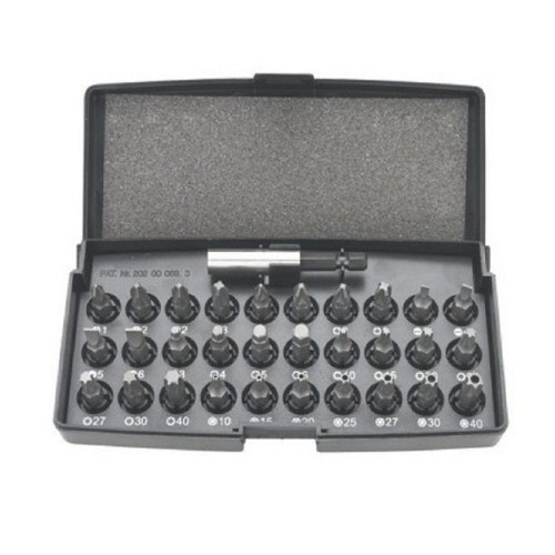 Комплектація: ручка 1/4, 60 мм, магнітна, 30 шт. змінних наконечників 25 мм, сталь S2, розміри: шліцеві 3, 4, 5, 6 мм, хрестові PH1, 2 x PH2, PH3, PZ1, 2 x PZ2, PZ3, Torx T10, T15, T20, T25, T27, T30, T00, T40 TT20, TT25, TT27, TT30, T40, шестигранні H3, H4, H5, H6, пластмасовий футляр.