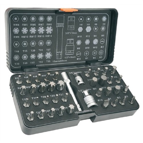 Комплектація: тримач для наконечників 90 мм, магнітний, 2 перехідники для змінних наконечників: 3/8 x 10 мм, 1/2 x 10 мм, 36 шт. наконечників 30 мм, розміри: шліцеві 8, 10 мм, хрестові PH1, PH2, PH3, Torx T10, T15, T20, T25, T27, T30, T40, T45, T50, T55, шестигранні H4, H6, H8, M10, H1 M10, M12, Ribe RM4, RM5, RM6, RM7, RM8, RM9, RM10, RM12, RM13, RM14, сталь S2, пластмасова валізка.