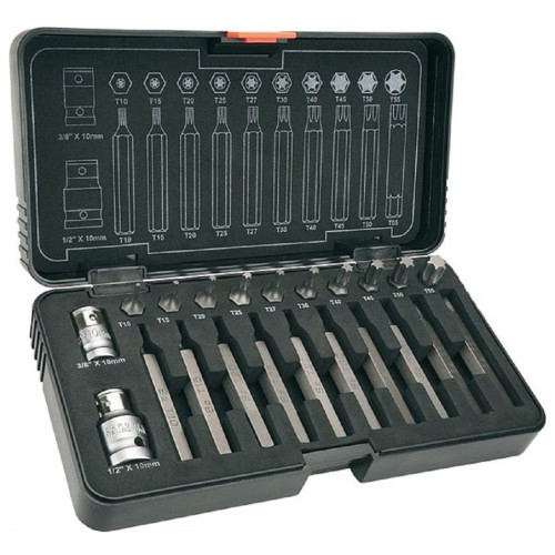 Комплектация: 2 переходника для сменных наконечников: 3/8 x 10 мм, 1/2 x 10 мм, 10 шт. наконечников 30 мм, размеры Torx T10, T15, T20, T25, T27, T30, T40, T45, T50, T55, 10 шт. наконечников 75 мм, размеры Torx T10, T15, T20, T25, T27, T30, T40, T45, T50, T55, сталь S2, пластмассовый чемоданчик.