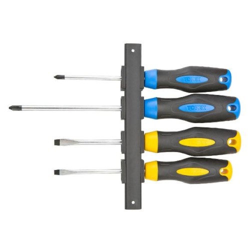 Деталі: Викрутки, набір 4 шт., Загартоване жало, намагнічене жало, сталь CrV, двокомпонентна рукоятка, розміри: 5 x 100 мм, 6.5 x 100 мм, PH1 x 100 мм, PH2 x 150 мм, з вішалкою.