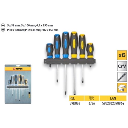 Детали: Отвертки, набор 6 шт., закаленное жало, намагниченное жало, сталь CrV, двухкомпонентная рукоятка, размеры: 5 x 38 мм, 5 x 100 мм, 6.5 x 150 мм, PH1 x 100 мм, PH2 x 38 мм, PH2 x 150 мм, с вешалкой.