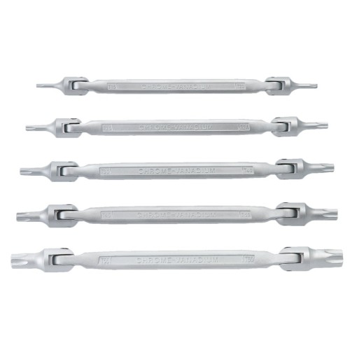 Набір ключів шарнірних Torx NEO, у наборі 5 ключів популярних розмірів (від T15 до T60). Високосортна хромованадієва сталь гарантує багаторічну міцність. Великий робочий діапазон головки (220 °) полегшує роботу у важкодоступних місцях. Інструмент упакований у зручний футляр з нанесеними номерами ключів, що сприяє збереженню порядку. Якість інструменту підтверджена сертифікатом TÜV та 25-річною гарантією виробника. Бренд NEO виправдовує очікування фахівців.