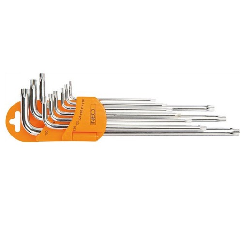 Комплект ключів Torx NEO. У наборі 9 ключів із розмірами від T10 до T50. Високосортна легована сталь S2 забезпечує тривалий термін служби. Магнітні наконечники підвищують функціональність ключів. Набір у зручній упаковці. Якість інструменту підтверджена сертифікатом TÜV та 25-річною гарантією виробника. Бренд NEO виправдовує очікування фахівців.