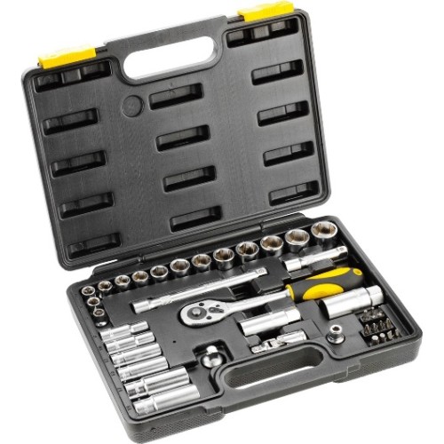 Набір торцевих ключів 1/2” TOPEX складається з 39 предметів, упакованих у зручну пластмасову валізку.
