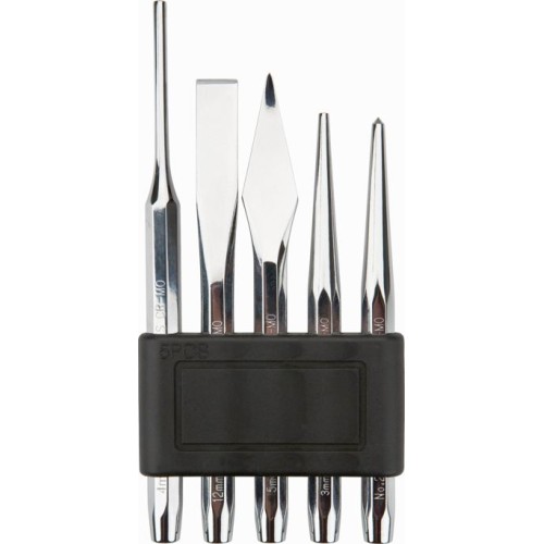Набір кернерів та пробійників 5 шт., пробійник 4 x 9.5 мм, зубило плоске 12 x 9.5 мм, зубило хрестоподібне 5 x 9.5 мм, борідок 3 x 9.5 мм, кернер 4 x 9.5 мм, сталь Cr-Mo.