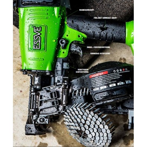 Высокую мощность, точность и прочность предлагает кровельный пневматический нейлер Essve CRN 15/45. Устройство оснащено инновационными технологиями. Кровельный нейлер сочетает в себе новую систему использования воздуха с меньшими объёмами 1.4 л/мин (1 выстрел). Специальная разработка по новым технологиям ускоряет повышение давления и помогает точно забивать кровельные гвозди даже при высокой частоте выстрелов. Результат: полная мощность гвоздезабивателя для вбивания гвоздей при сохранении компактного дизайна инструмента.