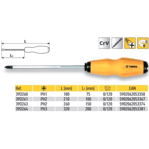 | Артикул | Крестовая + Philips (PH) | Длина отвертки L[mm] | Длина стержня L1[mm] |