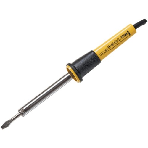 Паяльник електричний Topex призначений для монтажу електронних компонентів та провідників на друковані плати за допомогою свинцево-олов'яного припою та флюсу, а також для демонтажу електронних пристроїв. Оснащений змінним мідним паяльним стрижнем, який трохи сплющений і має форму плоскої викрутки.