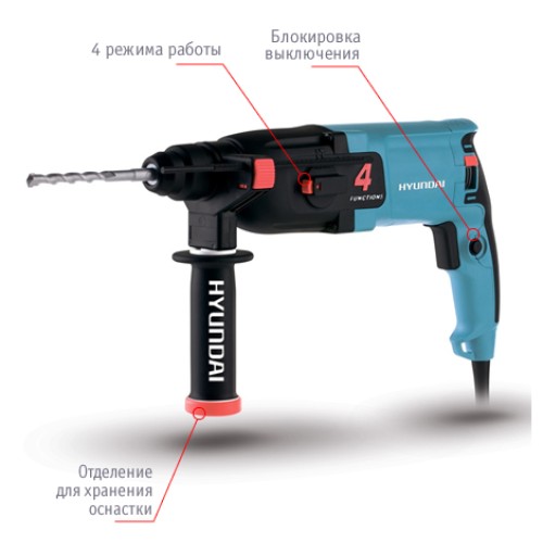 Перфоратор Hundai H 850 - сучасний багатофункціональний електроінструмент, що має чотири режими роботи: свердління, свердління з ударом, довбання, вільне довбання. Завдяки потужному двигуну насадка розвиває швидкість до 1250 обертів за хвилину.