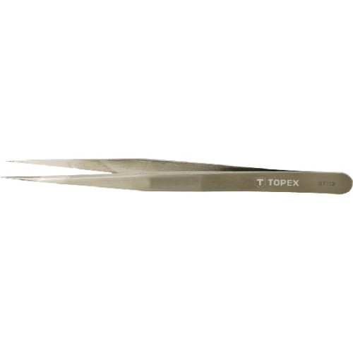 Пінцет Tоpex завдовжки 135 мм. Призначений для точних робіт. Виготовлений із високоякісної загартованої сталі, вуглецева сталь, твердість 40 HRc. Бренд Topex.
