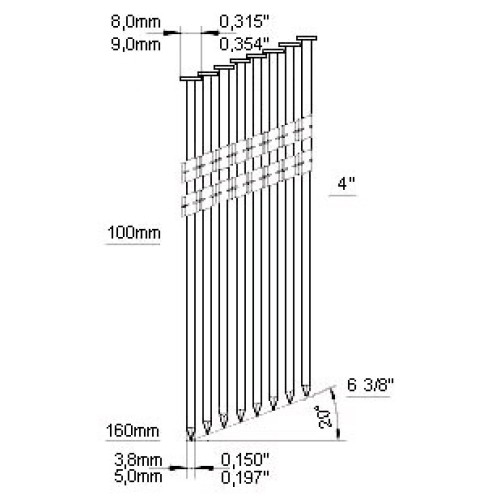 Тип цвяха: цвях з круглим капелюшком, у стрічці під кутом 20° довжина цвяха 100 - 160 мм
